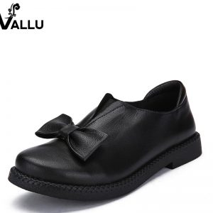 2017 VALLU New Arrival Women Shoes Flat Heels Genuine Leather Bowtie Round Toes Platform Black Plus Size 10