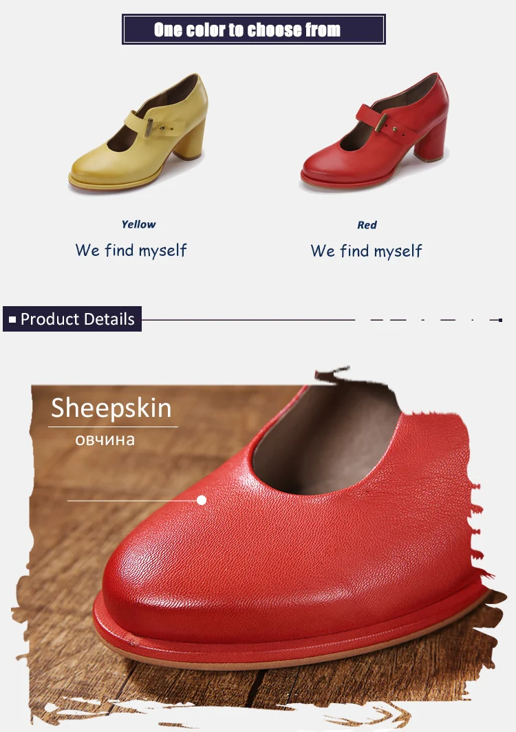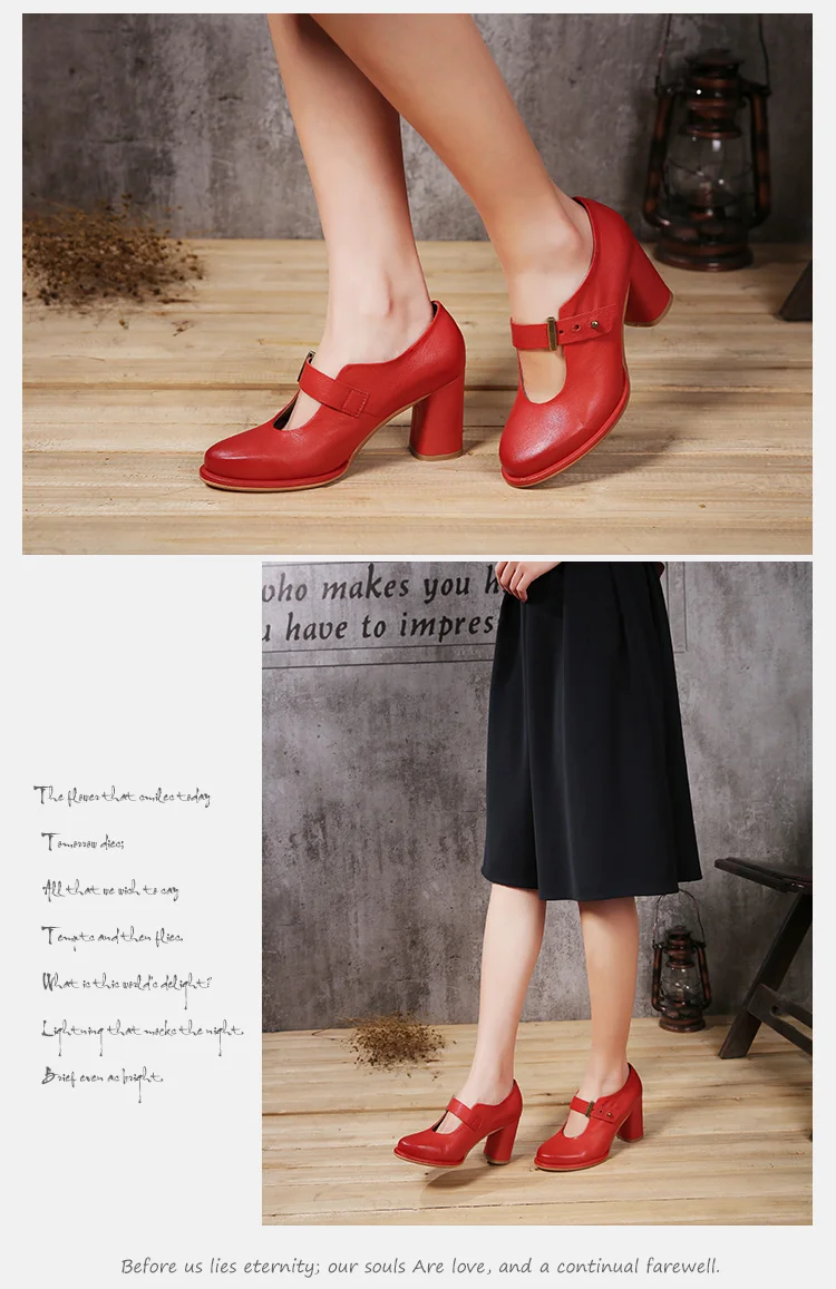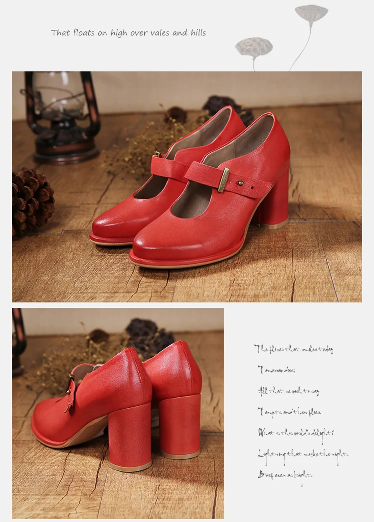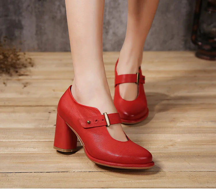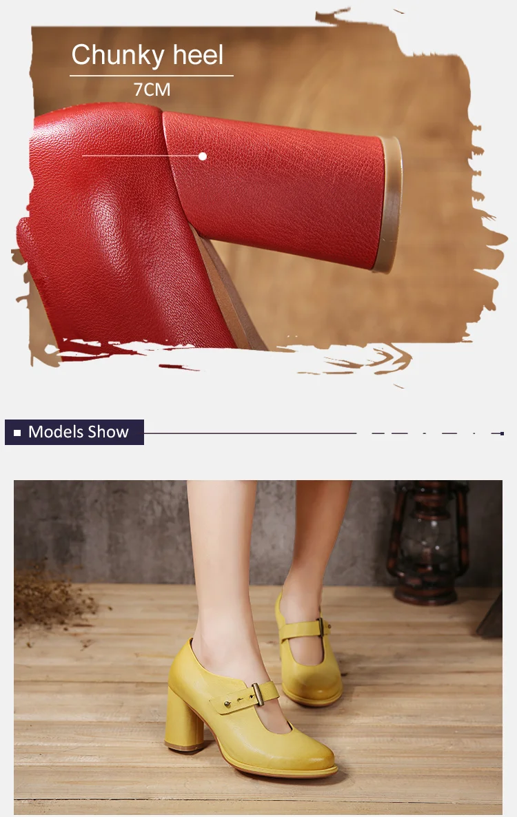 2017 VALLU Women Pumps Genuine Leather High Heel Shoes Genuine Leather Chunky Heels Buckle Handmade Vintage Style