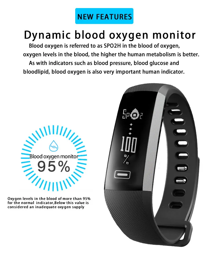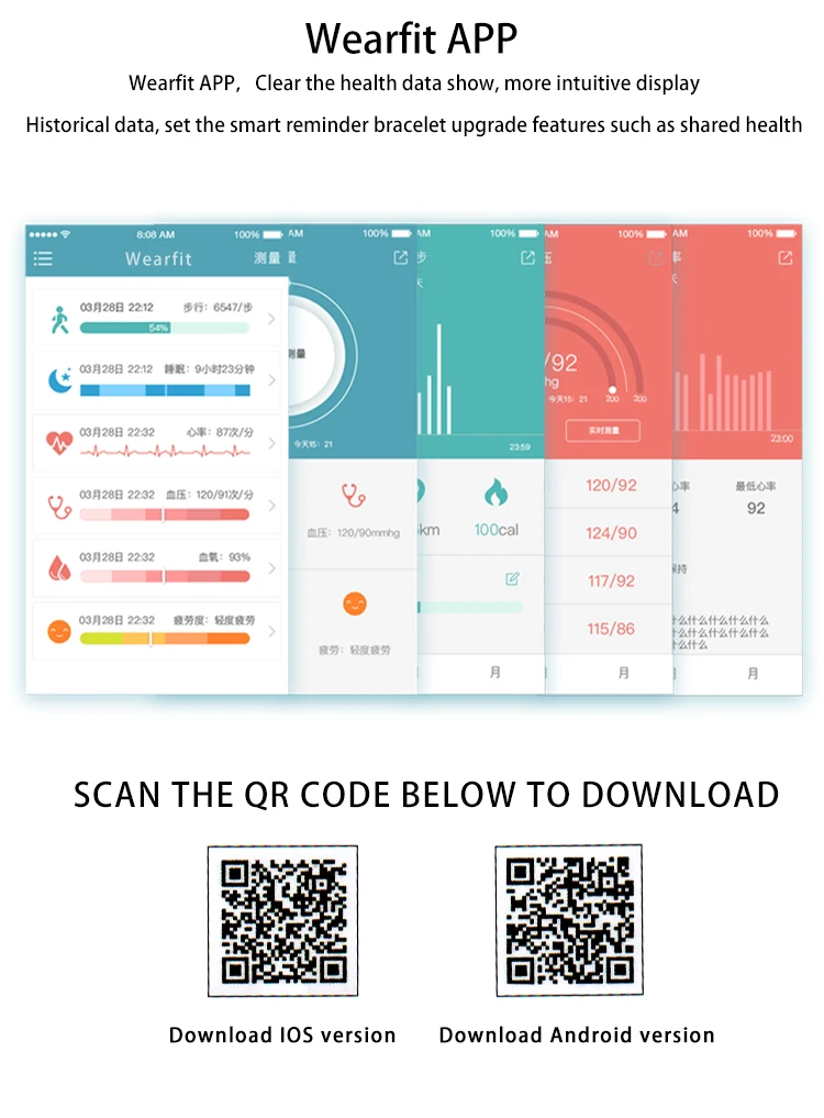 1:​Heart rate 2:Blood oxygen 3:Blood pressure measurement 4:Fatigue measurement 5:Sports step counter 6:Energy consumption 7:Daily mileage 8:Sleep monitorin 9:Call ID 10:SMS Reminder 11:APP Reminder 12:Sedentary reminded 13:Alarm clock reminder Kindly Note: For Andriod Phone, OS must be 4.4 or above and Bluetooth must be V4.0 For ios phone, iOS must be 8.0 or above and Bluetooth must be V4.0