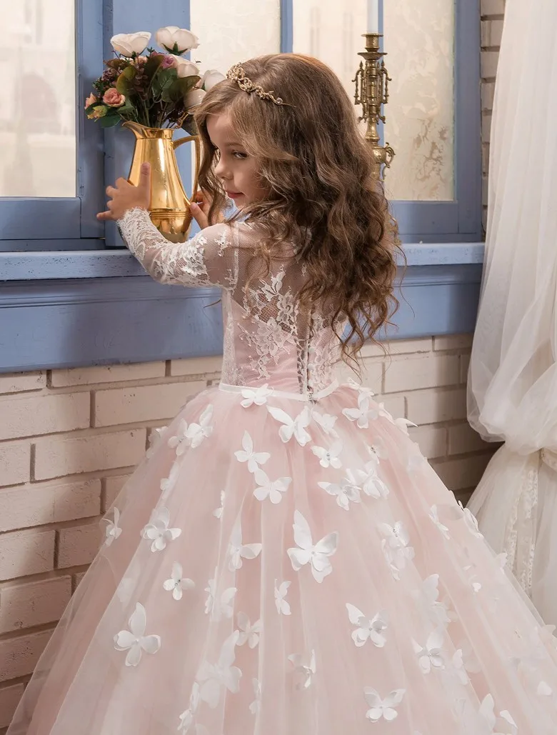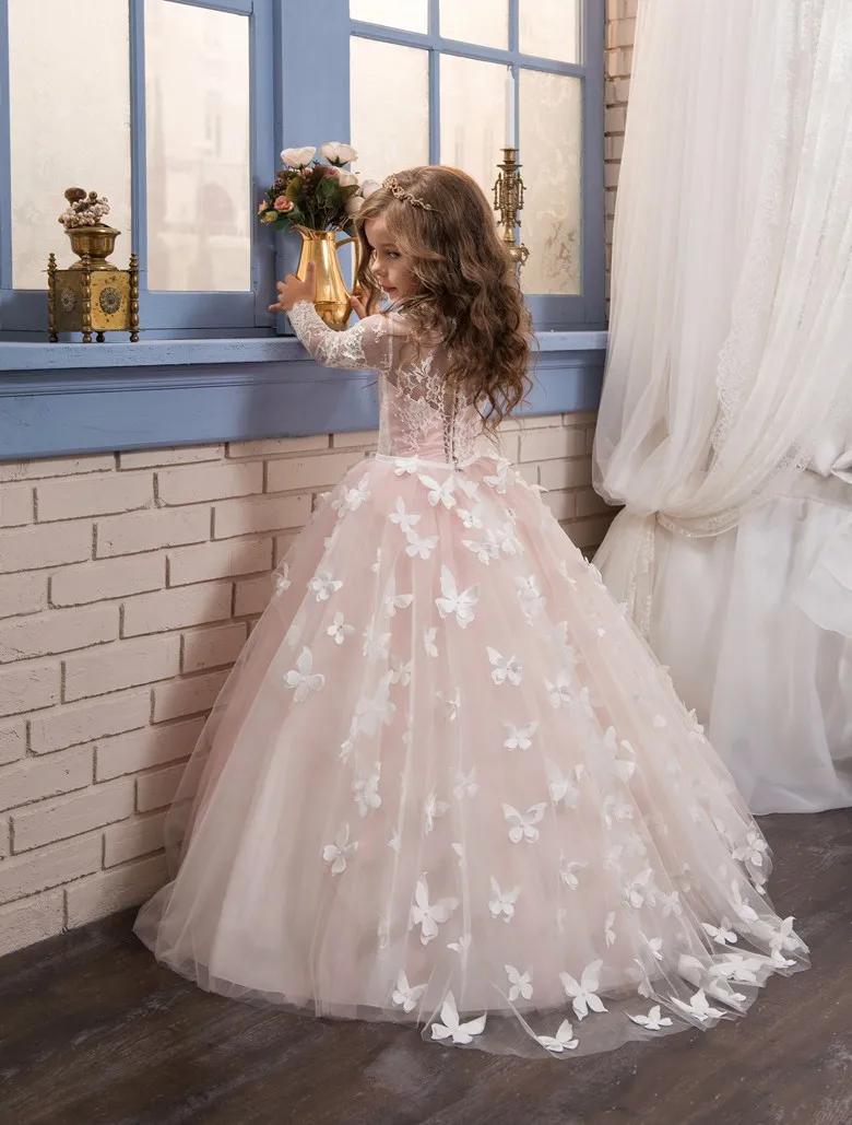 Fancy Flower Baby Girl Dress Child Long Sleeves Butterfly Pink Mesh Ball Gowns Kids Holy Communion Dresses 1-14 Year Old 2017