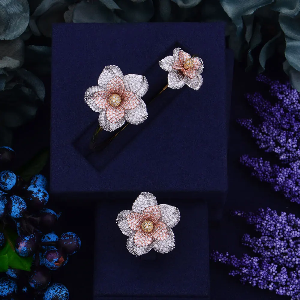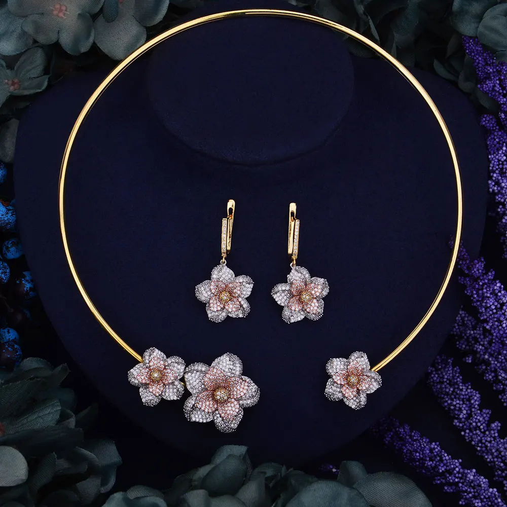 GODKI Fashion 3-Tone Multicolor Interval Luxury Bridal Wedding Flower Cubic Zirconia Necklace Ring Bracelet Earring Jewelry Set