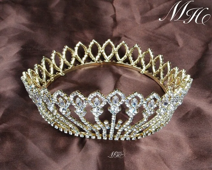 Description: You are looking at a floral full tiara crown. Sparkling Clear Genuine Austrian rhinestones are set in a beautiful gold-plated setting. There are 4 pin loops interior to help security. All rhinestones sparkle a lot and are prong set by hands! This crown is full of sparkle! It is perfect for wedding, pageant, prom, party, costumes or any special occasions. Thanks for looking! Size: Front center is approx. 3-5/8"(9cm) in Height and base of crown is 6-1/2"(16.5cm) in Diameter.
