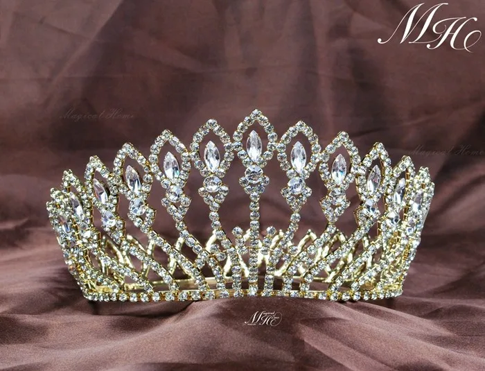 Gold Plated Flowers Full Bridal Wedding Crown Clear Rhinestone Crystal Large Tiara Pageant Hair Jewelry Accessories