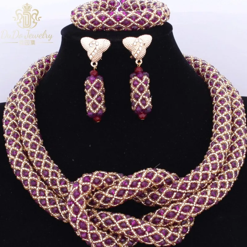 Gorgeous Nigerian African Wedding Beads Jewelry Set Store Purple And Gold Statement Costume Necklace Set 2017 Free Shipping Hot