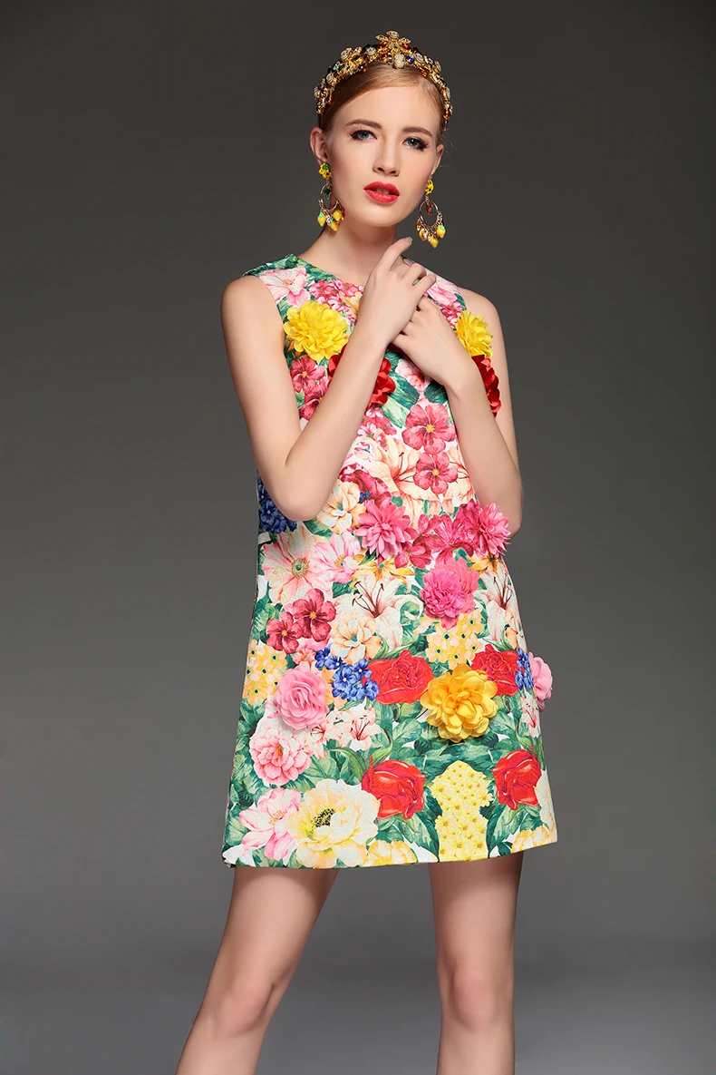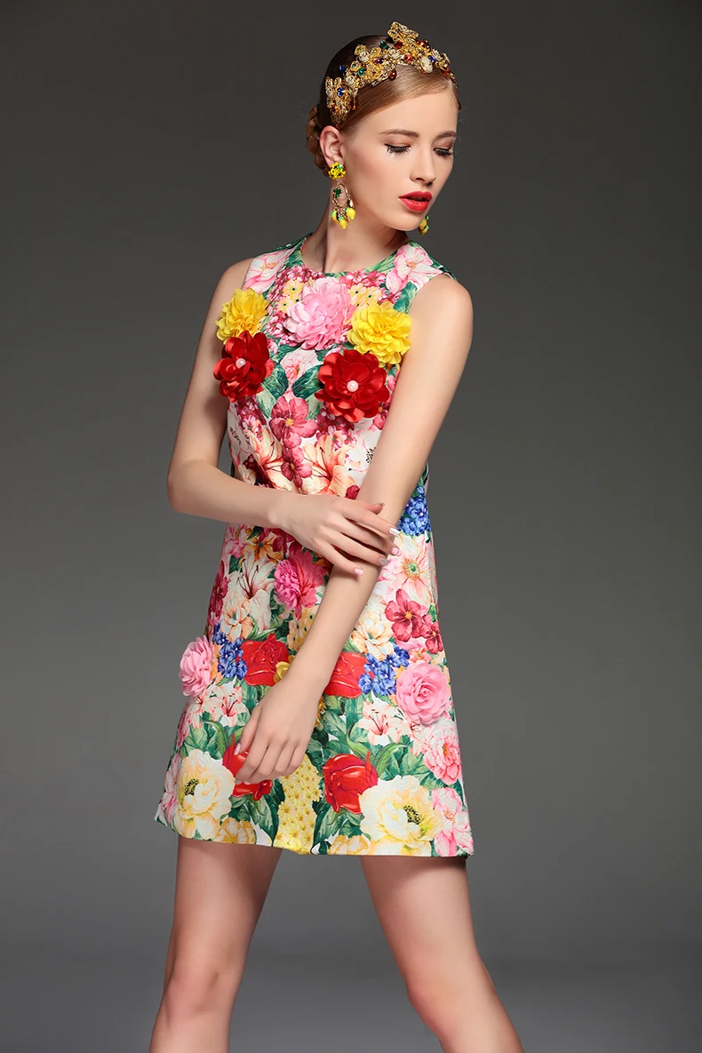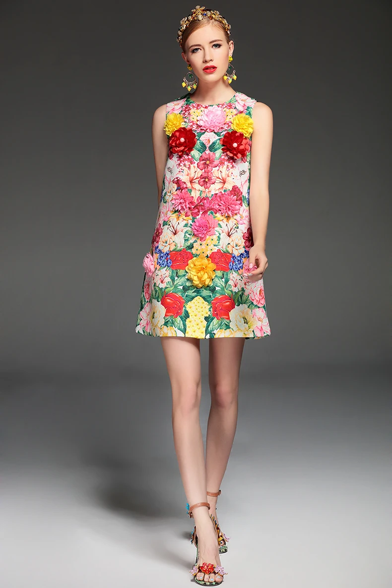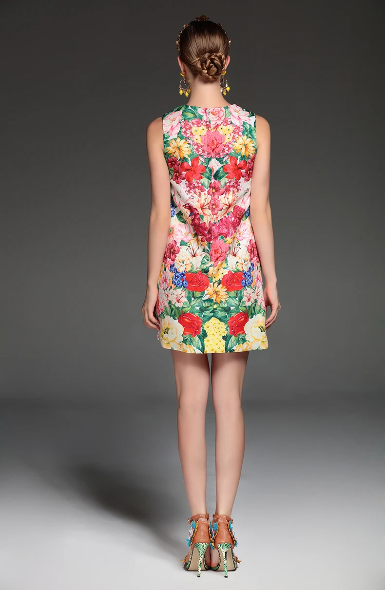 High Quality 2017 Summer Fashion Designer Runway Dress Women’s elegant Sleeveless Tank Floral Print Flower Applique Short Dress