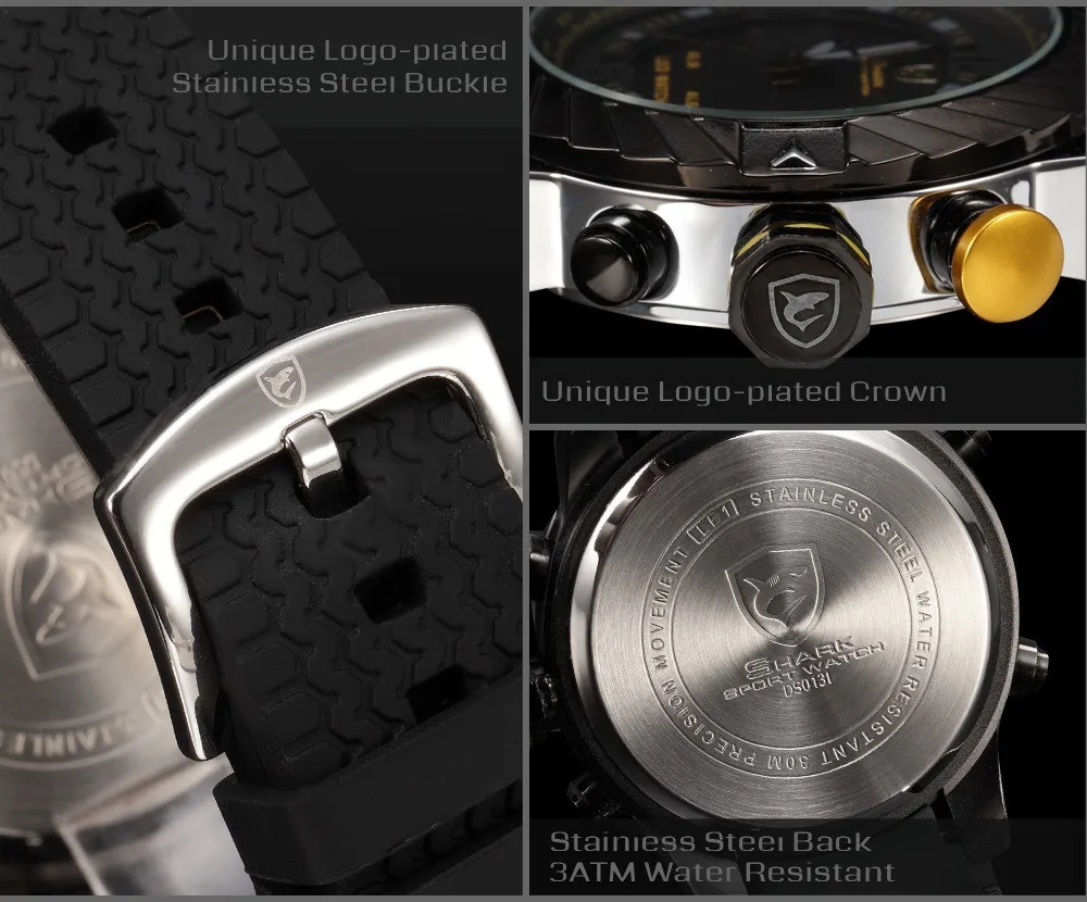 – Goblin S hark series 2nd Generation. – Designed by renowned Italian Watch Designer “Mr. Leonardo Cristiano”. – High precision quartz movement with the latest breakthrough Technology. – Specially designed with Big Case. – 3ATM Water resistant (Not suitable for swimming, diving, shower etc.). – 12-month International Guarantee. Specification (approximate): – Case Diameter: 4.9cm (1.93 inch) approx. – Case Thickness: 1.6cm (0.63 inch) approx. – Case Material: Stainless Steel. – Band Length: 21cm (8.27 inch) approx. – Band Material: Alloy + Silicone. – Band Adjustable: Yes. Package Included: – 1 x Genuine Shark Watch. – 1 x Official Box with 12-month Guarantee Card.