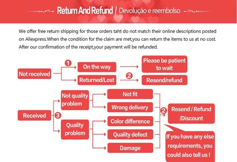 FAQ: 1. Are the products the same as the picture? 85-98% similar to the pictures, but there will be little color difference due to different monitors and lights. If you are doubt with some products, please contact us to confirm it. 2.Should I pay for the tariffs and charges? We are not responsible for the tariffs and charges. If your country is quite strict on the tariffs,when you place an order, you’d better tell us what value is ok to write on the package, otherwise, we will not take any responsibility for the tariffs and charges. 3. When will you ship my order ? Normally we’ll arrange the delivery within 24-48 hours after your payment is verified by Aliexpress, and it’ll be tracked within 2-7 days, any problems please contact us. 4. How long I can get my order ? The shipping time depends on the way of logistics and the country. And the holiday also can affect the shipping time. So the following logistics time is just for reference.If there is any problem, welcome to contact us. 5.If there are some problem, can I get my refund? Yes. If is all our fault, we will take the full Responsibility. We hope that you can negotiate with us first, not openning a dispute. We’ll do our best to solve it until you’re satisfied! 6.How about the quality of the item? Every goods will be 100% inspected carefully before delivery,and we try our best to make sure the items are good when reach you. Though it’s possible to have some small threads, dust or odd size, we do affordable kids wear but not luxury, please think twice before you order. 7.Can I take reseller price? Yes, you can take reseller price. As the shipping cost is higher for small quantity. So our unite price will be flexible. You can ask our sales beofore placing order. The more you take, the more discount you will have. NOTIECE: 1. We would like to deliver the goods to you as soon as we receive your payment, you are requested to double confirm your name, address, telephone number are full and correct, so that you can receive the items successfully. 2. Brzail Customers please provide your CPF number.