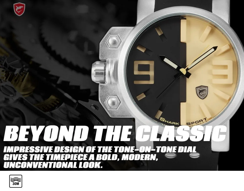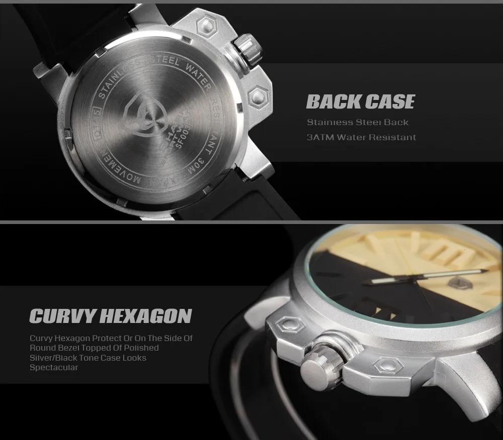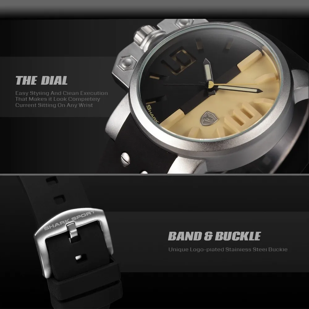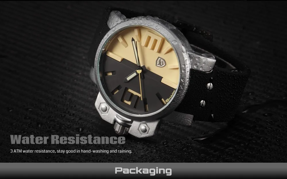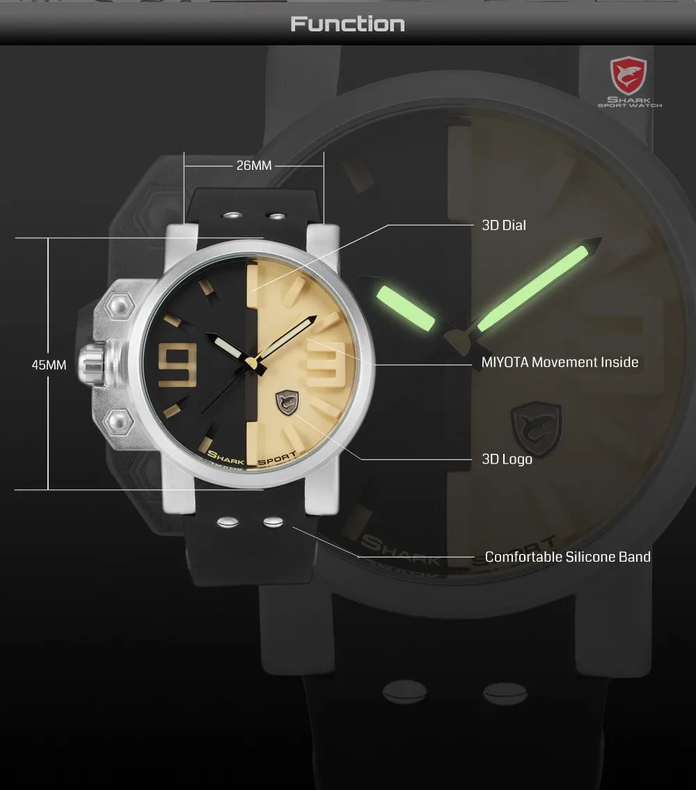Salmon Shark Sport Watch Stainless Steel Case Black Yellow 3D Analog Luminous Hands Rubber Outdoor Mens Quartz Wristwatch /SH170 Description: – Beyond the classic, impressive design of the tone-on-tone dial gives the timepiece a bold, modern, unconventional look. Easy styling and clean execution that makes it look completely -current sitting on any wrist. – Polished Silver/Black case – Over-sized crown, easy to adjust the time – Comfortable silicone band with stainless steel buckle Main Features: – Salmon Shark Series – Designed by renowned Italian Watch Designer “Mr. Leonardo Cristiano”. – High precision quartz movement with the latest breakthrough Technology. – Specially designed with “Stainless steel” Big Case. – 3ATM water resistant – 12-month International Guarantee Specification (approximate): – Case Diameter: 4.5cm (1.77 inch)approx. – Case Thickness: 1.3cm (0.51 inch)approx. – Case Material: Stainless Steel – Band Length: 19.0cm (7.48 inch)approx. – Band Material: Silicone – Band Adjustable: Yes Package Included: – 1 x Genuine Shark Watch – 1 x Official Box with 12-month Guarantee Card