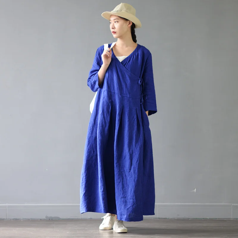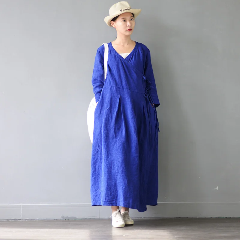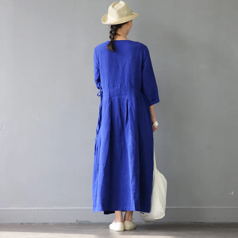 SCUWLINEN Vestidos 2017 Spring Autumn Dresses Solid Vintage V-neck Three Quarter Long Linen Dress Women Casual Sexy Robe S303