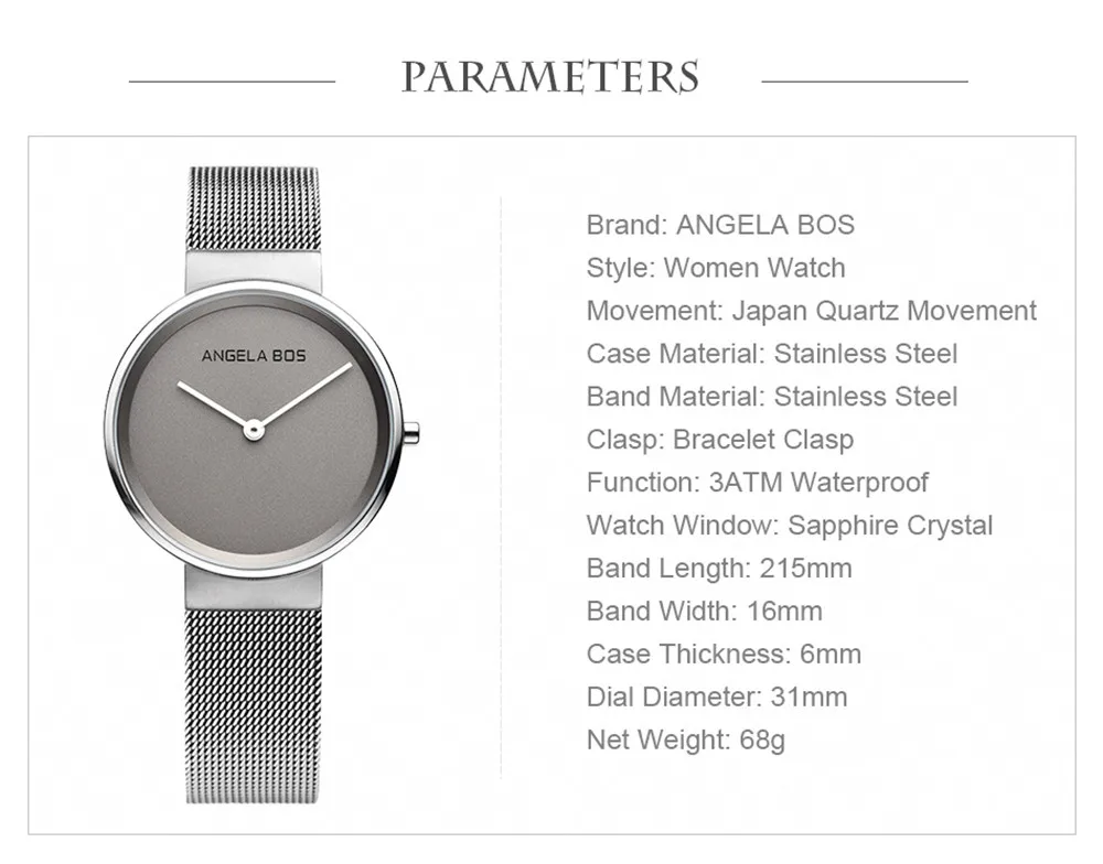 Description: 1.Dial diameter:31 mm(Women),40mm(Men) 2.Dial thickness:6 mm 3.Band Width:16mm(Women),18mm(Men) 4.Band Lenght:21.5 cm(Women),22.3 cm(Men) 5.Water Resistant:30M Waterproof (not for swimming or diving) 6.Nordic design, thin simple double needle, no second, no scale. 7.Sapphire crystal glass mirror, milan steel belt.