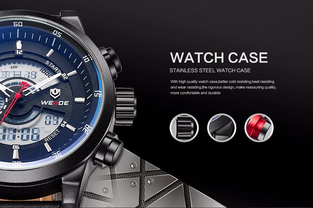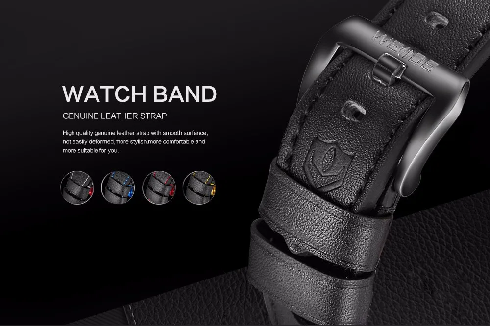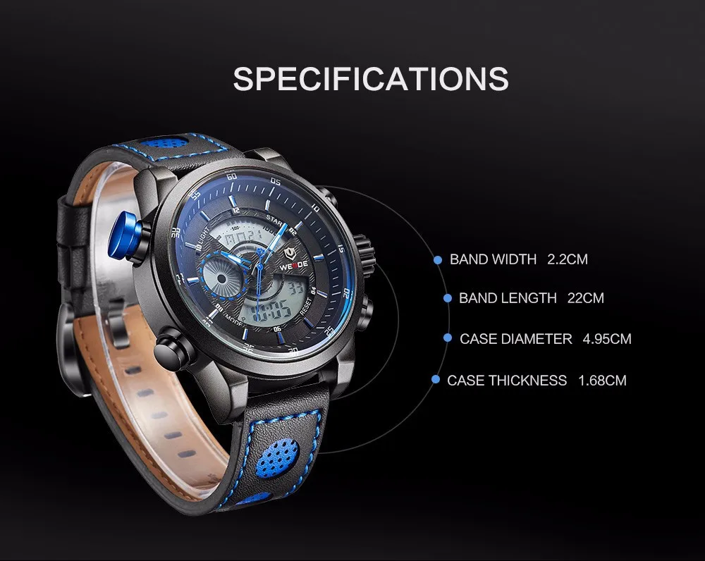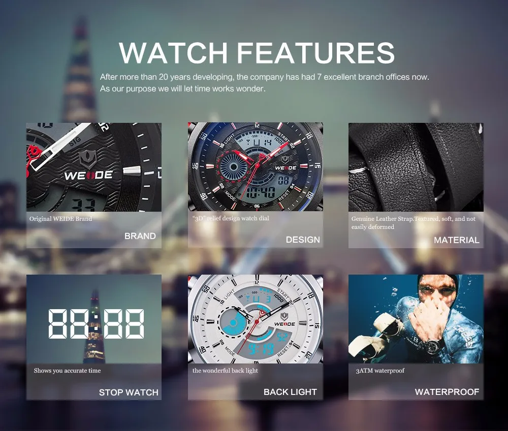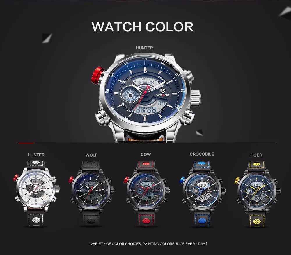 WEIDE Genuine Leather Watches Men Quartz Digital Fashion Military Casual Sports Watch Luxury Brand Relogio Outdoor Wristwatches BRAND: WEIDE ITEM: WH3401 STYLE: SPORT,CASUAL,BUSINESS,FASHION DISPLAY: Analog & Digital Movement: Original Japan Miyota 2035 Quartz + LCD Digital Features: – WEIDE(WH3401) sports watch with 6 versions; – Original Japan Miyota 2035 Quartz Movement and LCD digit movement; – Hour,minute,second,date,month,week,alarm,stop watch,12/24 hours and back light functions – High abrasion resistant glass; – Watch crown with environmental IPS bronze electroplating; – Environmental IP Silver vacuum electroplating Case; – High quality Leather strap; – Stainless steel buckle & back case with 3D "WEIDE" logo – 3-year long life battery – Walking on error ± 45S / M – 12-month Original Factory Quality Guarantee – 30 meters water resistant(Please Don’t Press Any Key Underwater, Not suitable for swimming, diving, shower etc.) Specification (approximate) : Case Diameter: 4.95cm (1.95 inch) approx Case Thickness: 1.68cm (0.65 inch) approx Band Length: 22 cm(8.66 inch) approx Band Width: 2.2cm(0.87 inch) approx Clasp:Buckle Components Included: -1 x WEIDE Watch -1 x Users’ Manual -1 x Gift Box Warm reminder: latest package is replacing the former package, now the package will be used randomly.