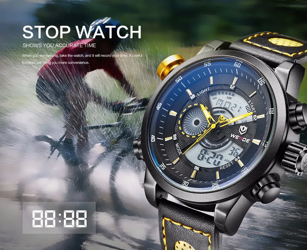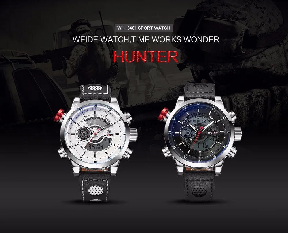 WEIDE Sport Watch 3ATM Quartz Digital LCD Dual Time Date Day Alarm Chronograph Leather Band Strap Outdoor Men Wrist Watch